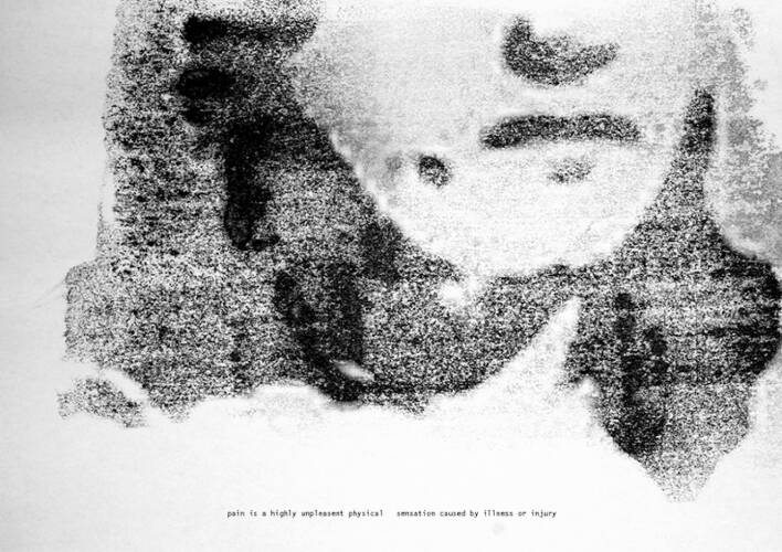 "Focusing on the main concept of the book -dissolution of identity-I endorsed a physical disappearance photographic performance: With the use of chemicals, the original images were transferred into a new paper, vanishing their original form and suggesting only their traces.