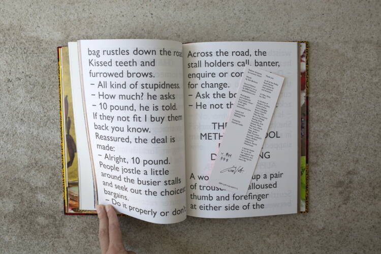 LORENZO VITTURI’s work is often found at the intersection of sculpture and photography and his latest project, Dalston Anatomy, saw him spend time in London’s Ridley Road Market taking pictures, making sculptures and creating collages with materials and objects he found amongst the debris of the marketplace. Vitturi’s process is largely concerned with the creation, consumption and preservation of images. The makeshift sculptures he created mimic the organic and temporary nature of the market, and their documentation is the way in which they endure after diminishing. The book is bound in exquisite Vlisco fabrics in bright patterns that are reminiscent of African markets and accompanied by a poem by Sam Berkson that layers voices from the market to draw on its disjointed and surreal atmosphere.