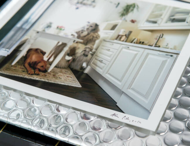 Comments: Limited to 25 copies, signed and numbered, 5 different prints to choose 13 x 17 cm (printed on Hahnemühle Fine Art Ultra Smooth and signed below the photograph) limited postcard, JUST THE TWO OF US hologram sticker, silver metallic envelope wrap with sticker BOOK: Leporello, handmade, 645cm folded to 38 pages, hardbound, black cardboard cover with silver-metallic hot foil stamping, 26×16.6 cm (open: 26 x 645 cm), printed on Munken uncoated paper, English text.