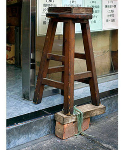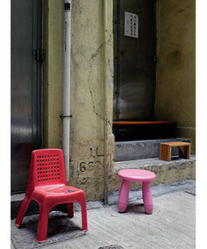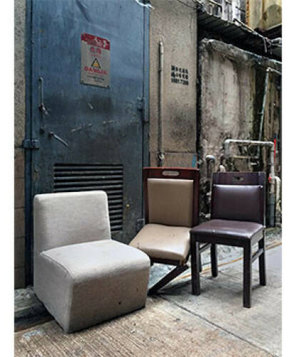 Sitting people do already for a long time. Therefore chairs have been manufactured ever since. In Hong Kong many of them end up on the street. Plastic chairs, wicker chairs, armchairs, stools, bar stools, office chairs. Old and new, whole, broken, rebuilt and repaired. Together with alienated crates, cartons, wooden blocks and foam pillows they form curious roadside seating ensembles for the short relaxation or a little chat in between.