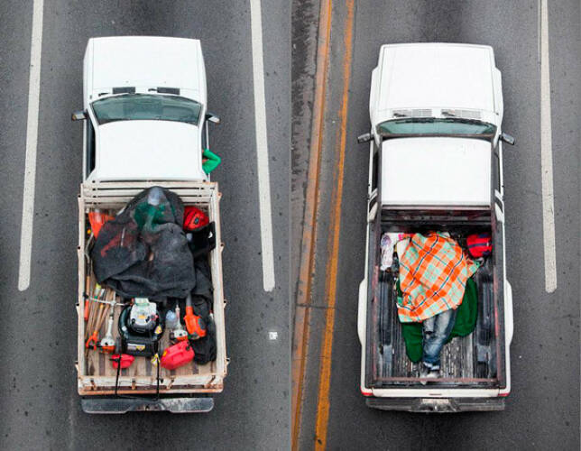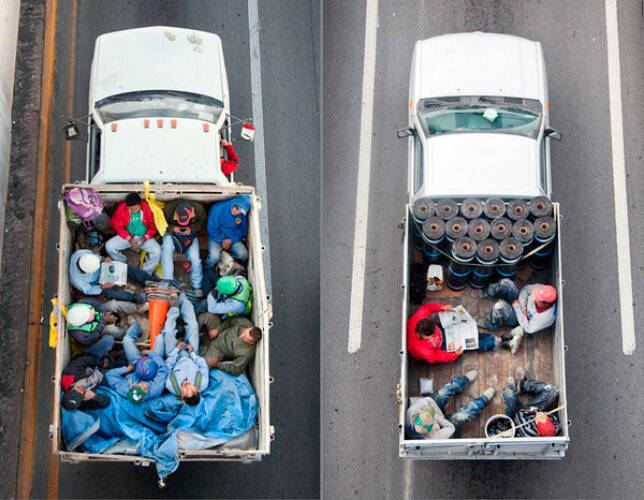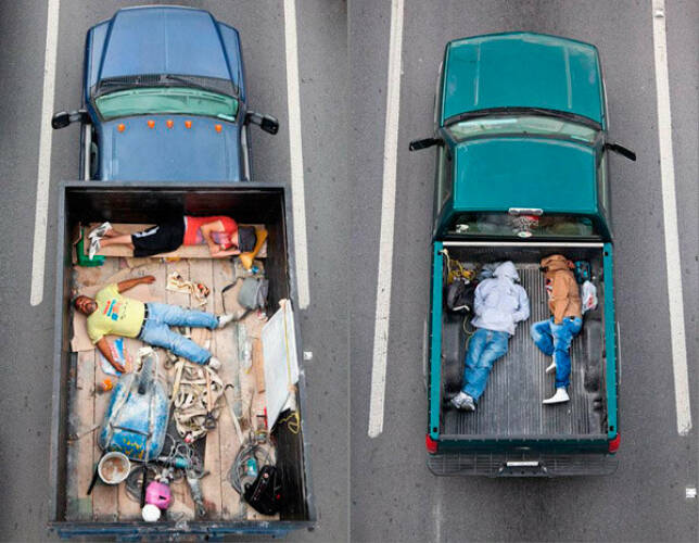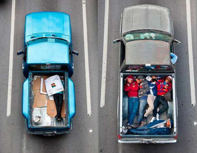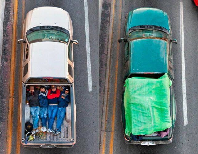 "Car Poolers is a project that continues my visual research on how the Mexican suburbs impact the landscape, the city and its inhabitants. I´ve been shooting the project for a year on Monterey's highway 85 going south bound to one of the richest cities in Latin America, San Pedro Garza Garcia, one of the nine cities that form the Metropolitan area. I shoot from a pedestrian overpass that looks over the cars coming out of a small tunnel and "predict" which trucks might have people in the back. These images present a not-so-subtle observation of overgrowth issues in Mexico; where suburbs are being built in far away lands, far from the urban centers, causing greater commutes and consumption of gas."