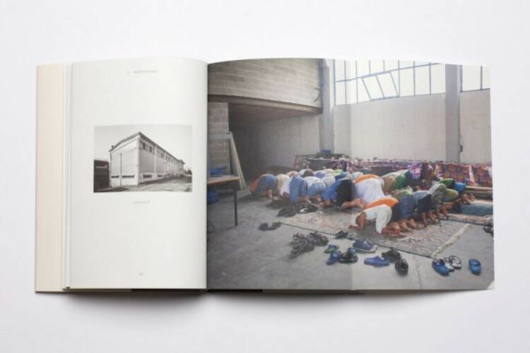 This shortage of places to worship is particularly acute in north east Italy – where the photographer Nicolò Degiorgis lives – home to many anti-Islamic campaigns headed by the right wing party Lega Nord. The dull images of the many and diverse buildings that house the makeshift mosques are printed on folded pages. You open up the gatefold to reveal the scenes inside the mosques, shot in full colour. The size of the gatherings varies, from large crowds who sometimes pray outside to a small room full to bursting, or to intimate groups of two or three Muslims.
