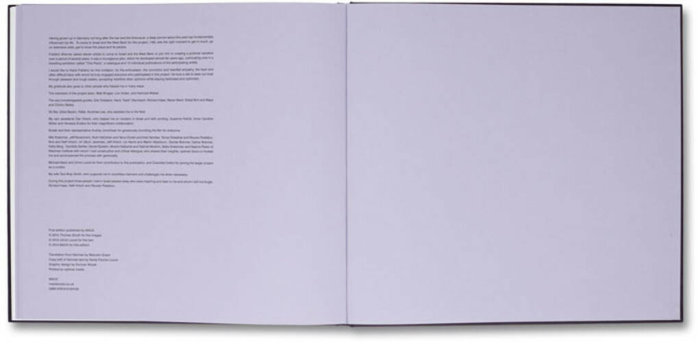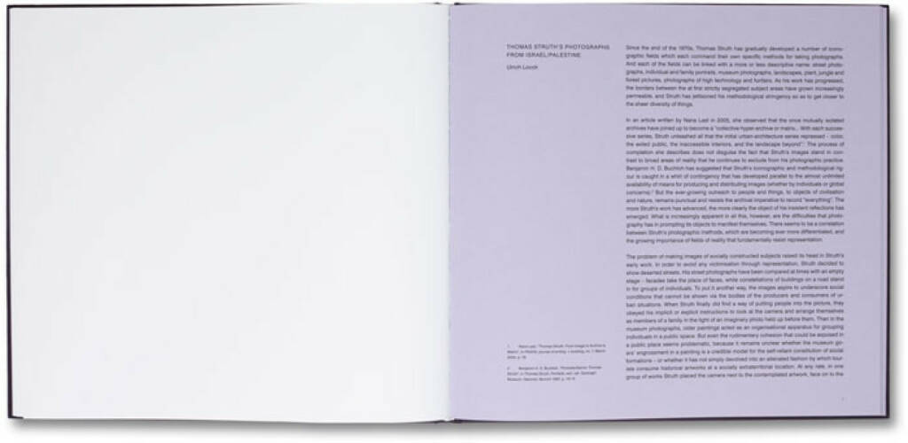 This book brings together sixteen photographs made by Thomas Struth in Israel and the Israeli-occupied West Bank in 2009, 2011 and 2014. Struth continued his practice of creating singular images, each within one of the strictly segregated subject fields he has developed through his career: street photographs, portraits, landscapes and photographs of high technology. Each image carries the enduring complexity and visual distillation of human experience for which Struth is known. Approaching the sheer diversity and quiddity of the inhabited world, he attempts to represent what he has referred to as “a particle of the conflict of the region”, to photograph, fragment by fragment, the conflicted political and social landscape. Ulrich Loock proposes in his essay in the book that this series of images is unified by “strata of antitheses [which] reveal themselves as a matrix running through the work”, as Struth attempts to grasp the circumscribed reality of a region where coexistence has failed, a reality that is inaccessible to photography.