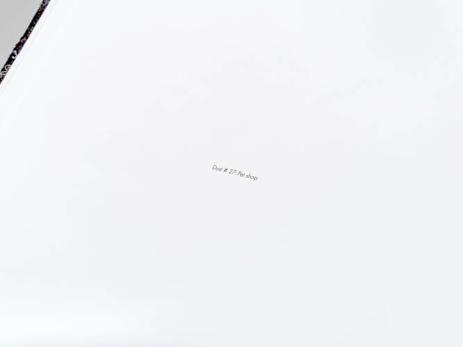 Comments: Hardcover wrapped with 2mm textile and flocked ‘Dust’ logo, handmade, 30x30cm (open: 30x60cm), 102 pages (4 pages transparent paper, 98 pages uncoated paper), 45 images. Including a folded poster, 50x70cm, printed on uncoated paper. First edition, 2015. Limited to 450 hand numbered and signed copies.