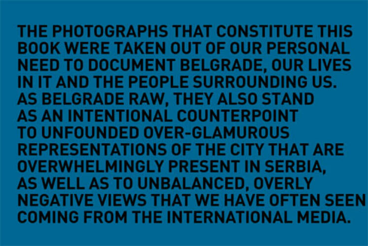 The photographs that constitute this book were taken out of our personal need to document Belgrade, our lives in it and the people surrounding us. As Belgrade Raw, they also stand as an intentional counterpoint to unfounded over-glamurous representations of the city that are overwhelmingly present in Serbia, as well as to unbalanced, overly negative views that we have often seen coming from the international media.