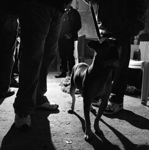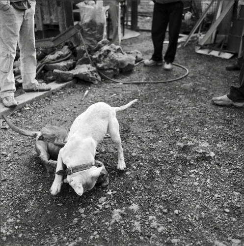 The photographic essay "We Are Dogs!" by Jaka Babnik is an auto-reflective study, motivated by the desire to uncover and demystify one of the society's acceptable forms of fighting. The photos take away the masques from the phenomena of dogfights, mostly by compelling one to ask oneself what is human as well as what the origins and purposes of fighting are. The elliptical character of the story, where the man's relationship with the dog rather than the man himself is in focus, reveals dogfights as a field in which human nature usurps violence and fighting in order to exercise its power(lessness). Exercising power(lessness) by humiliation and exploitation of animals is not only the final consequence of human destructiveness, it also forces us to rethink what we talk about when we talk about humankind. It seems that the fight for an omnipotent anthropocentric position is inherent to "humankind". Even more, it unfolds itself indirectly, through those lacking access to rational, human-like manipulation.