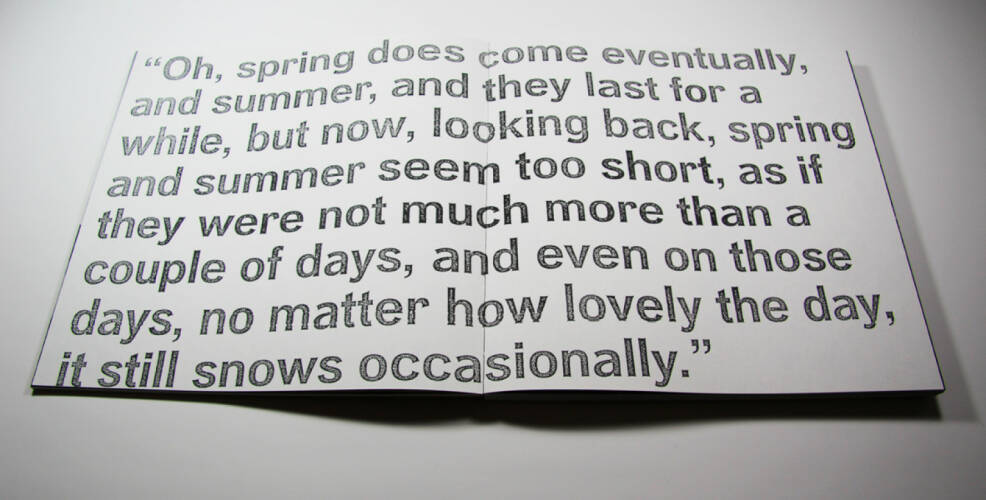 Comments: Designed by Teun van der Heijden, Hardcover, 30 x 30 cm. Print / Refining: cover 1/0 black, screen printing and blind embossing, content 108 pages 2/2, black, black Paper / Materials: content 108 pages 120 gsm Geese EOS bläulichweiß 2,0 vol., front-and endpaper 120 gsm offset white. Binding: open spine, thread stitch binding 8 pp. signatures, book cover 2.7 mm, cutted edges, straight back, front-/endpaper. First edition of 1500 copies.